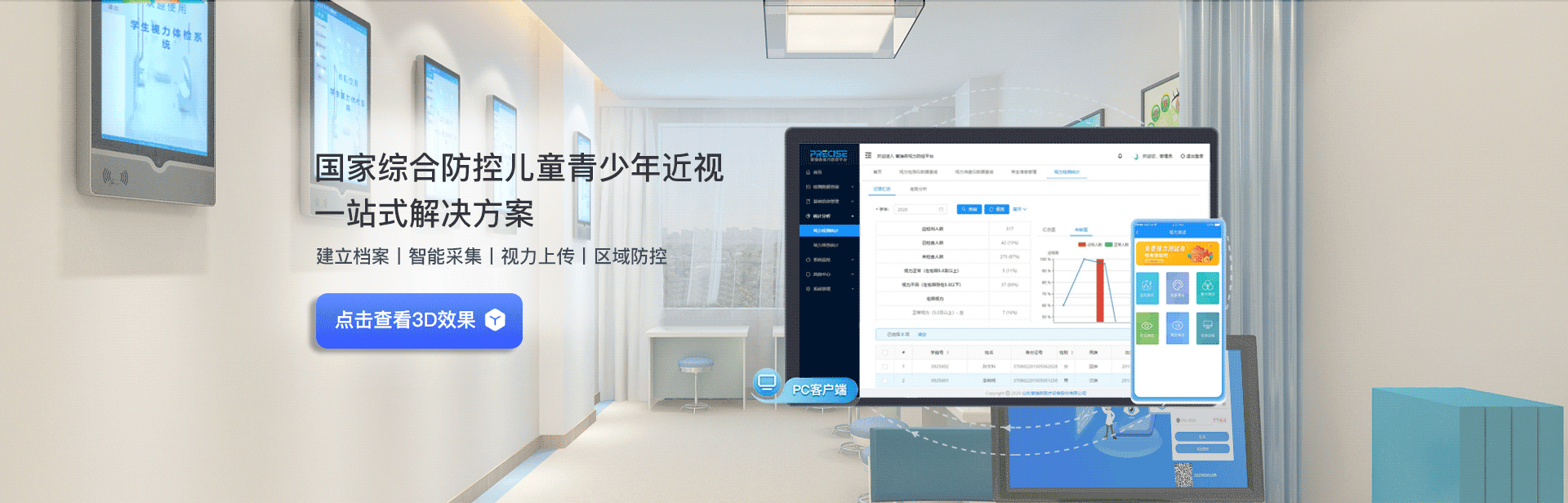 普瑞森青少年视力防控平台是运用互联网、物联网和移动通信等技术快速筛查青少年视力并建立健康档案的系统。由近视防控数据管理软件系统、电子视力检测仪、视力筛查仪组成,通过视力检测筛查设备,自助采集汇总数据并上传至云平台。支持视力数据采集、查询、统计、分析、存档于一体,通过分析体检者视力发展趋势,对不同视力人群进行健康干预和指导。